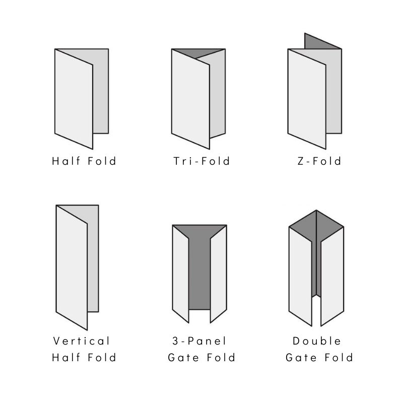 There are a number of standard folding types used in the printing industry. These are illustrated below. Of course, there are many more than we show here. If you have a question about a standard or special fold, please use the Contact Us in the main navigation menu above.